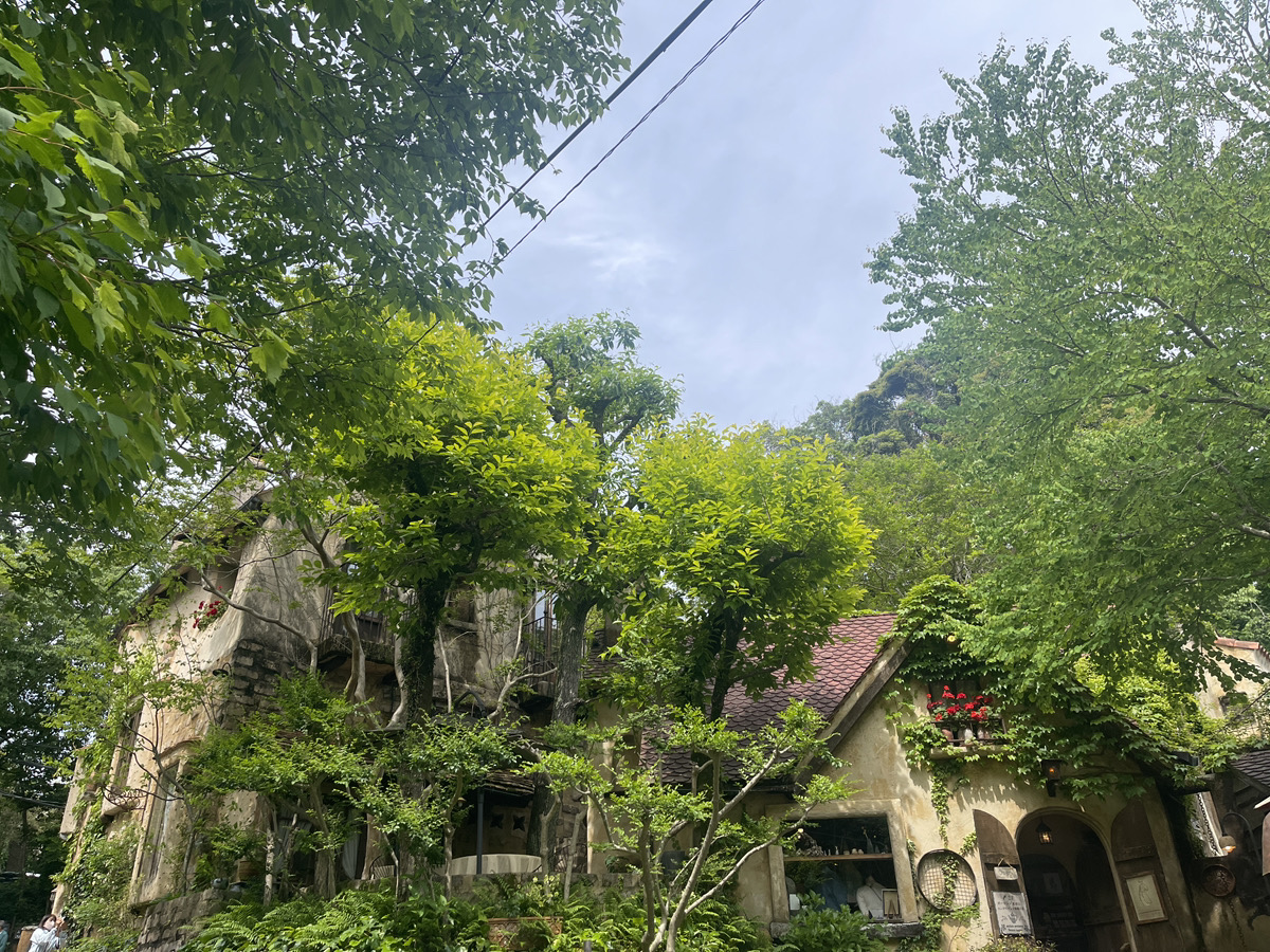 森の中に点在する小さなお店のかべにはつたが張り、個性のあるかたちの建物が多く、