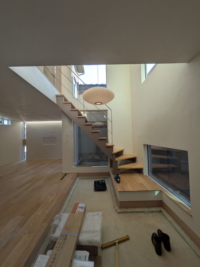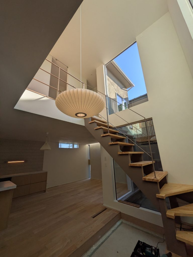 三段周りの納まりが難しく、階段を保持する方法と美観のバランス調整に苦労しました。
