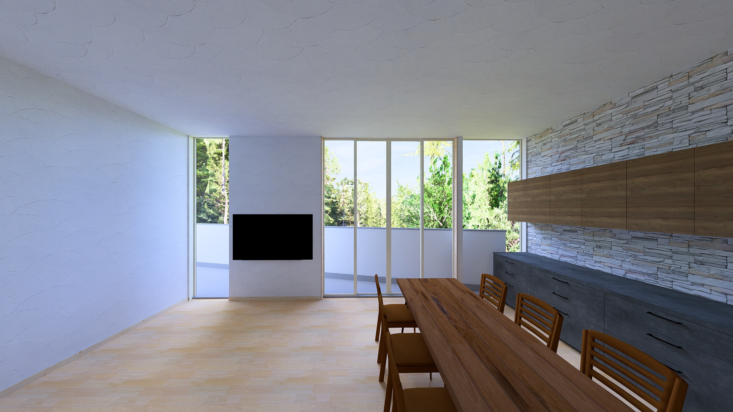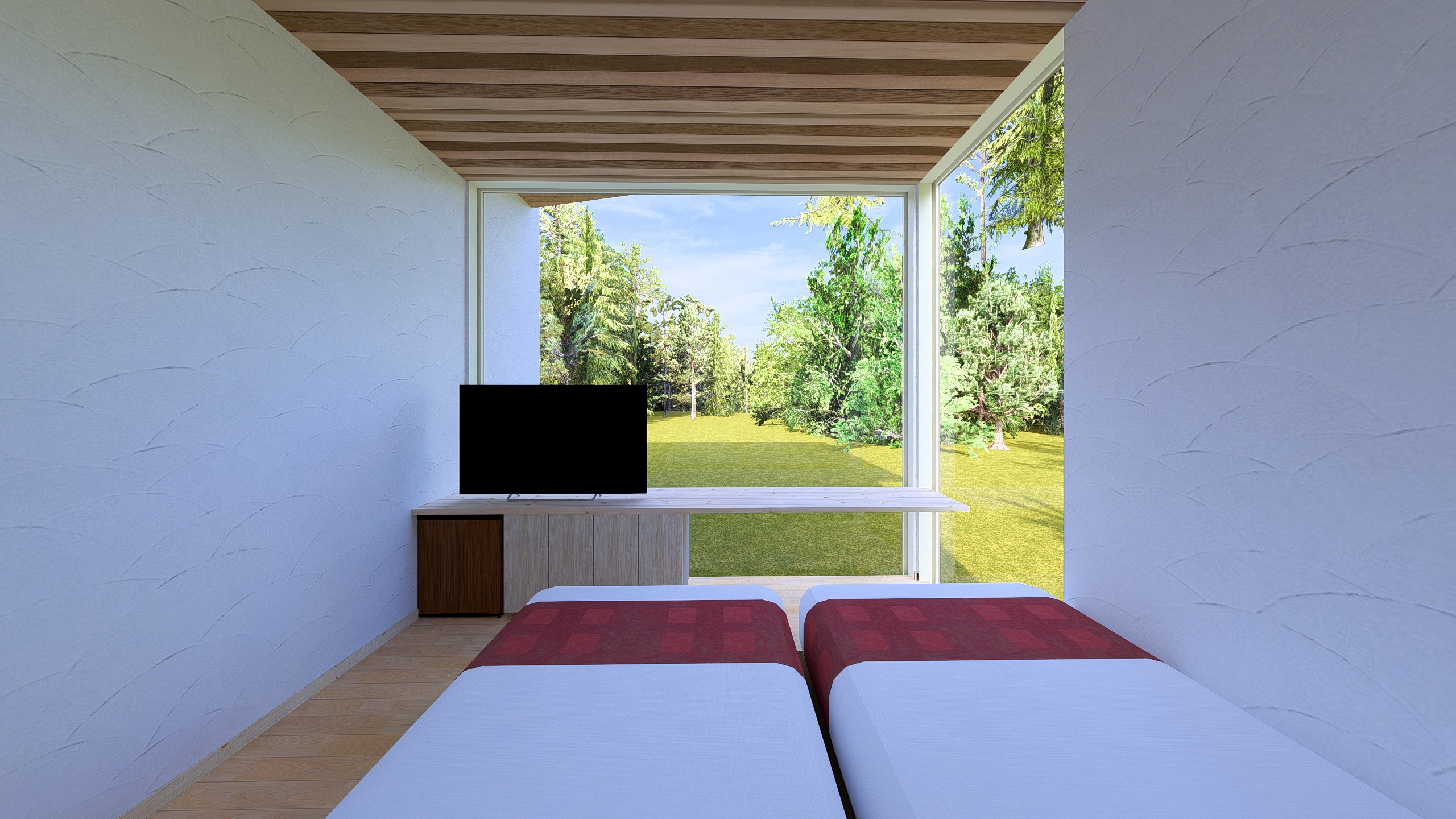 ガラスの向こうには森林が広がっています。