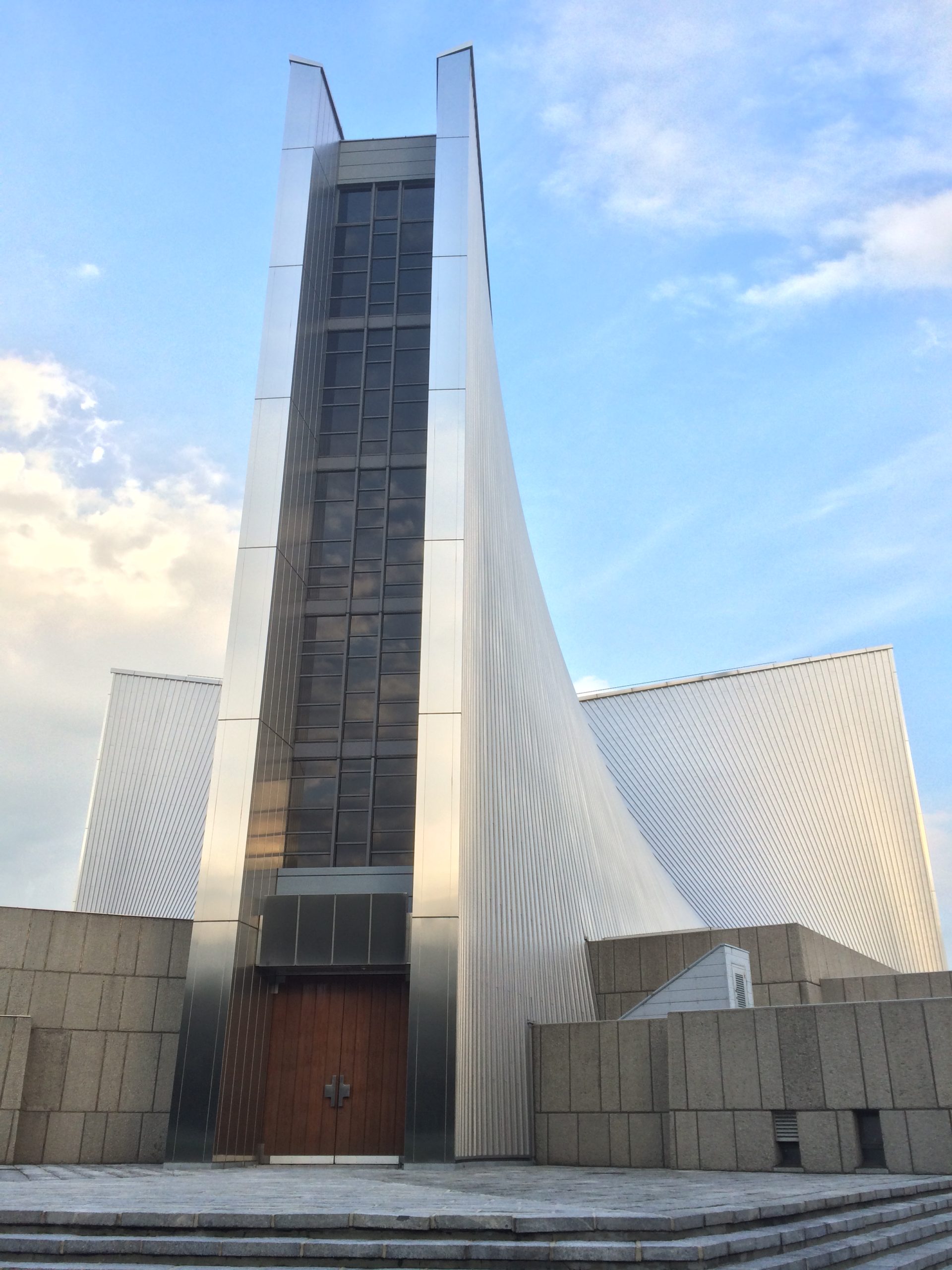 外観はステンレスの曲面によって構成された、とても力強いフォルム。十字架を形づくるように立ち上がるその姿は、写真で見るだけでも印象的ですが、実際に目の前にするとスケールの大きさに思わず立ち止まってしまいます。