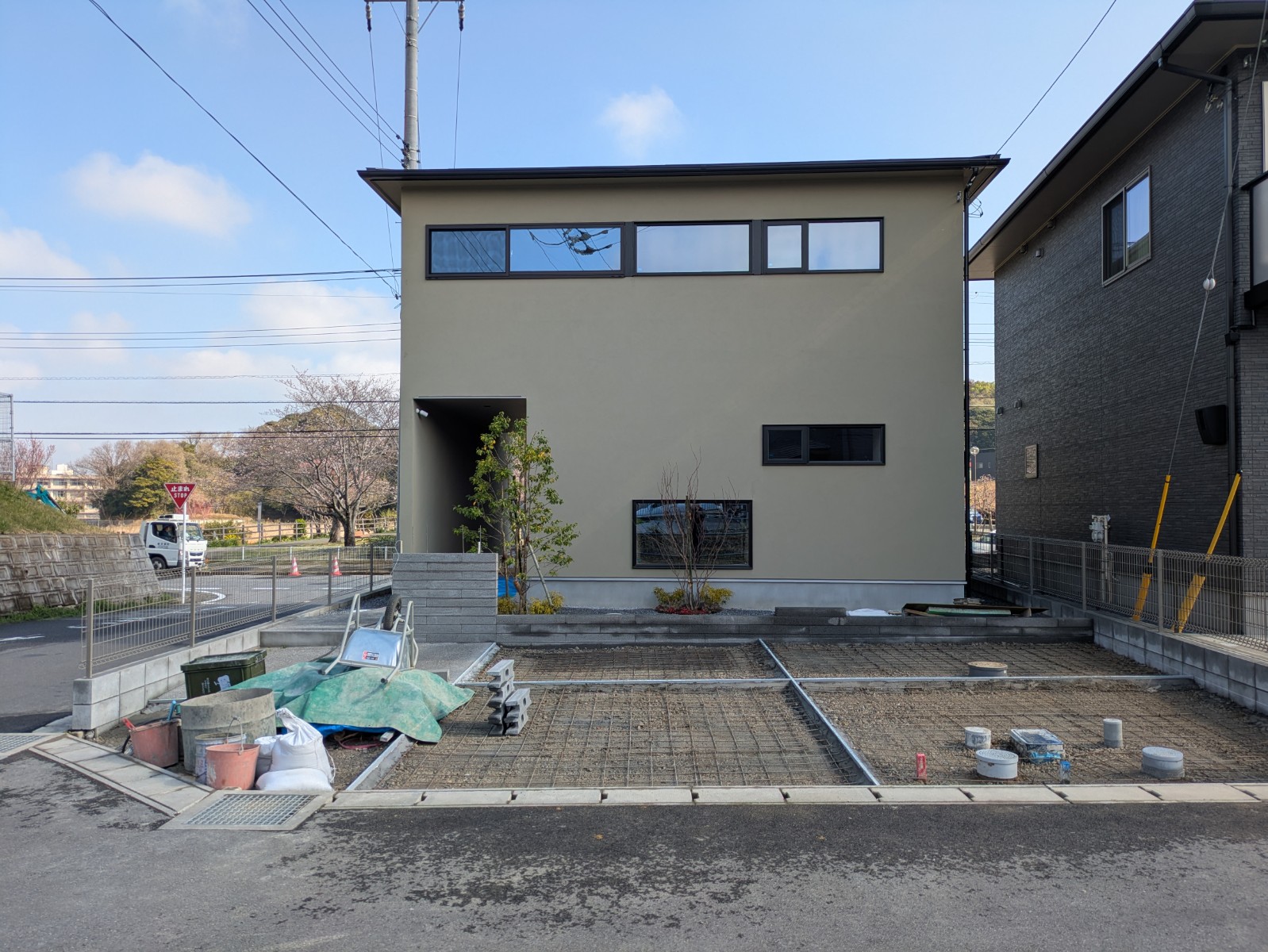 植栽、門柱と作業を進め、駐車場コンクリート打設3/30で完了です。