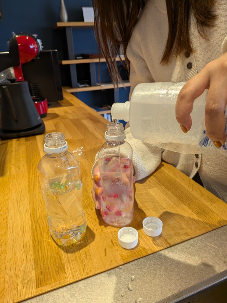 今回は、ペットボトルに水と洗濯のり、ビーズやスパンコールなどの小さな飾りを入れて、