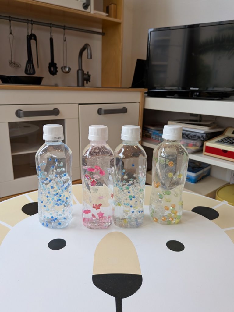 透明のペットボトルを使っているため、中身の動きがよく見え、感覚遊びとしてもとても好評です。