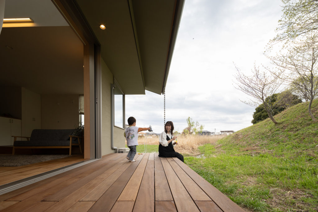 リビングからフラットに出られる広々とした縁側風ウッドデッキからは借景が楽しめます。