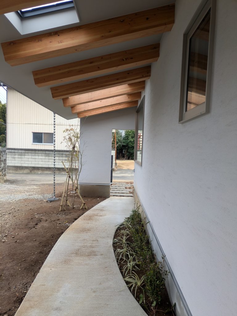 伸びている屋根も植栽を楽しみながら歩ける緩やかな土間のアプローチの素敵でした。