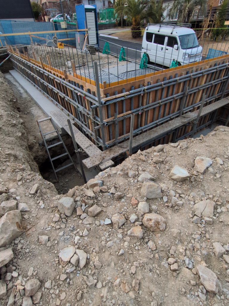 深基礎施工が終わると建物全体の基礎工事開始です。