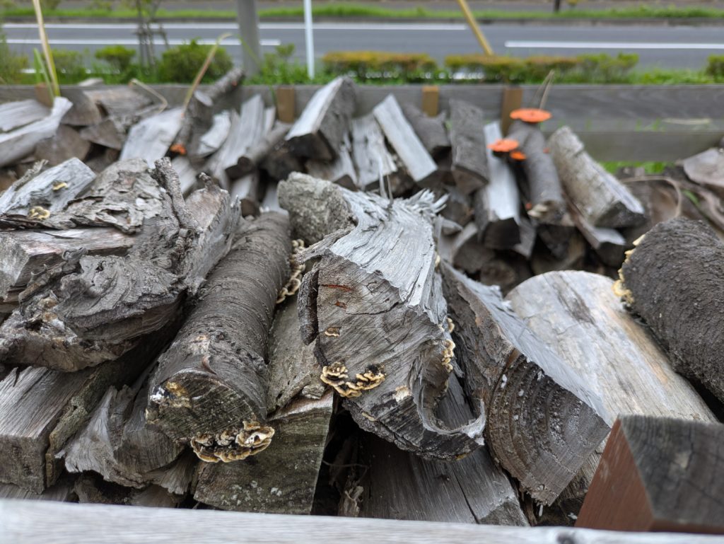 「ヘンなのが生えてる!」と一瞬びっくりしましたが、これは薪が自然に還ろうとしている証拠。切られた木材も、湿気や環境が整うと、こうしてキノコという形で命を繋ごうとするんですね。