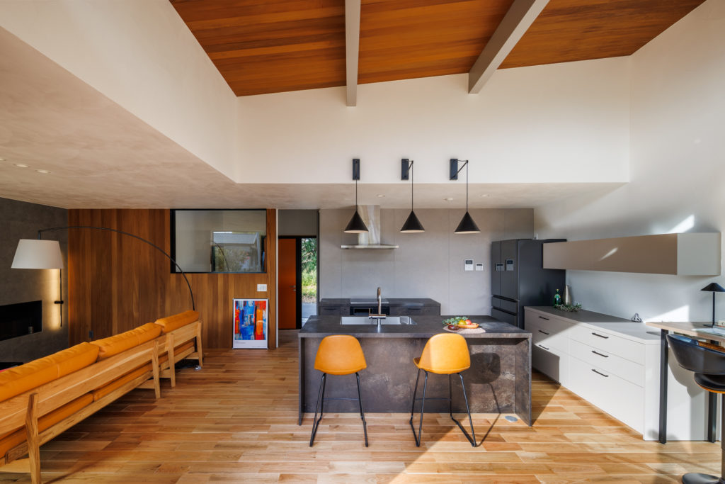 - 家族の気配を感じられる勾配天井や、造作家具による統一感