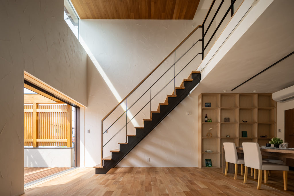 - 家族の気配を感じられる吹き抜けや、造作家具による統一感