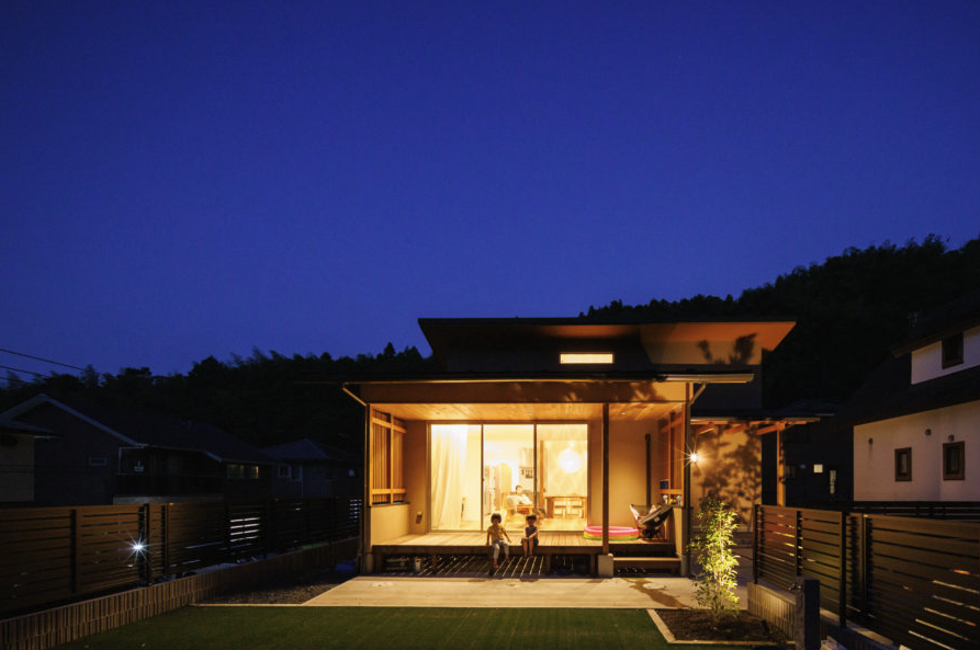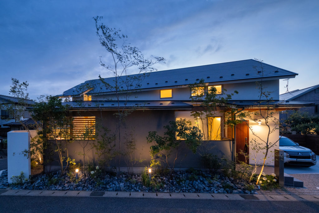 この住まいは、夜の外観にまでこだわった設計が特徴です。日が暮れると、室内の明かりが外壁や軒天にやわらかくにじみ、昼間とはまったく異なる表情を見せます。