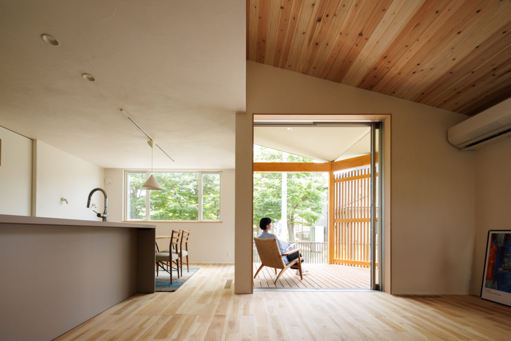 深く軒がかかった縁側デッキは、雨の日でも日差しが強い日でも快適に過ごせる半屋外空間に設計したのもポイントです。ウッドデッキとフラットにつながるリビングは、実際の面積以上の広がりを感じさせます。