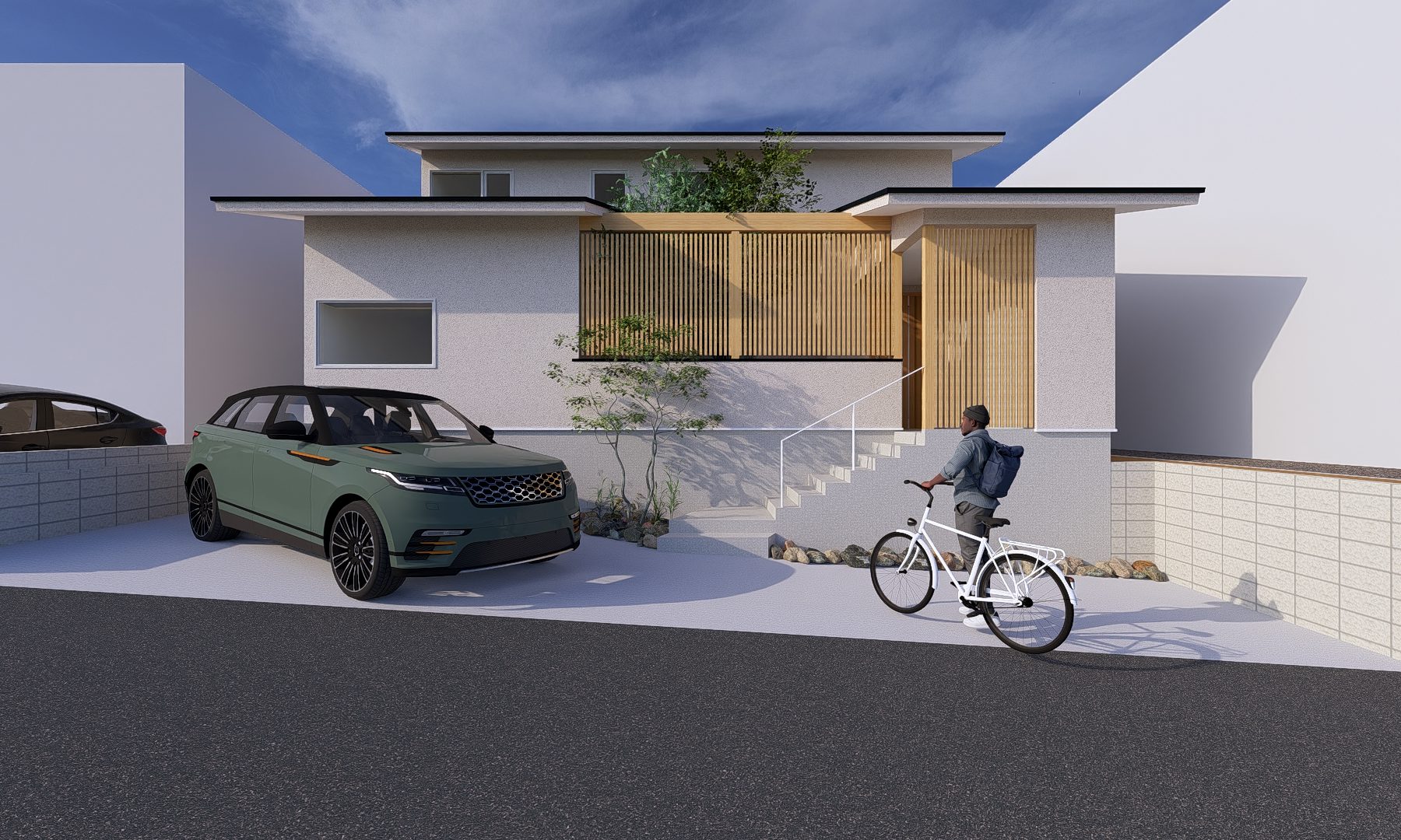 竹林の脇に建つ、ガレージのあるモダンハウス。