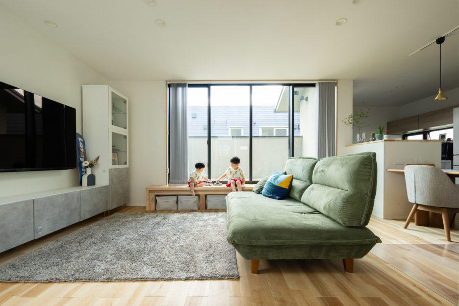 光がたっぷり入るリビングは、家族が集まる心地よい空間。