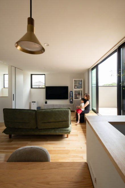 大きな窓からの光が、家族の時間をやさしく包み込みます。