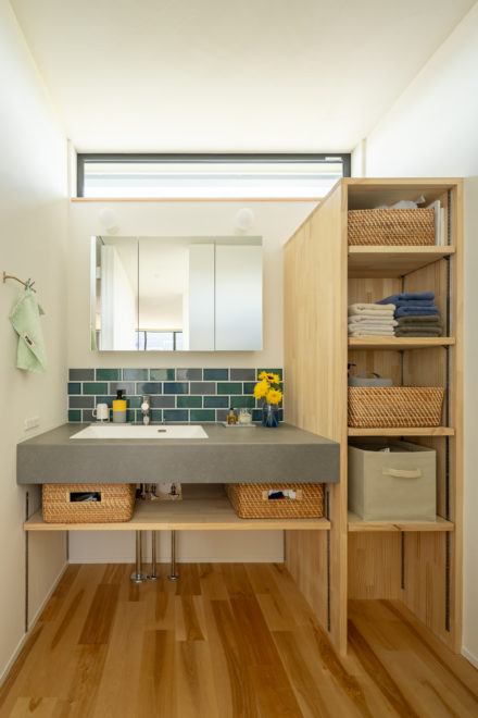爽やかな色合いのタイルがアクセント。鏡裏収納やオープン棚で、日用品がすっきり収まります。