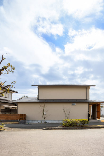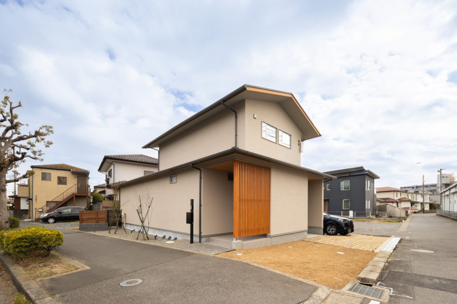 都会的なベージュの塗り壁に、木の質感が調和する和モダンな外観。