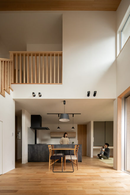 キッチンに立つと、リビングで寛ぐ家族だけでなく、隣接する小上がりの和室まで見渡せる設計に。