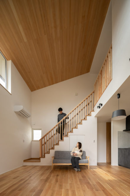 高窓から差し込む陽光が室内を照らし、日中は照明をつけなくても家中が柔らかな明るさに満たされます。