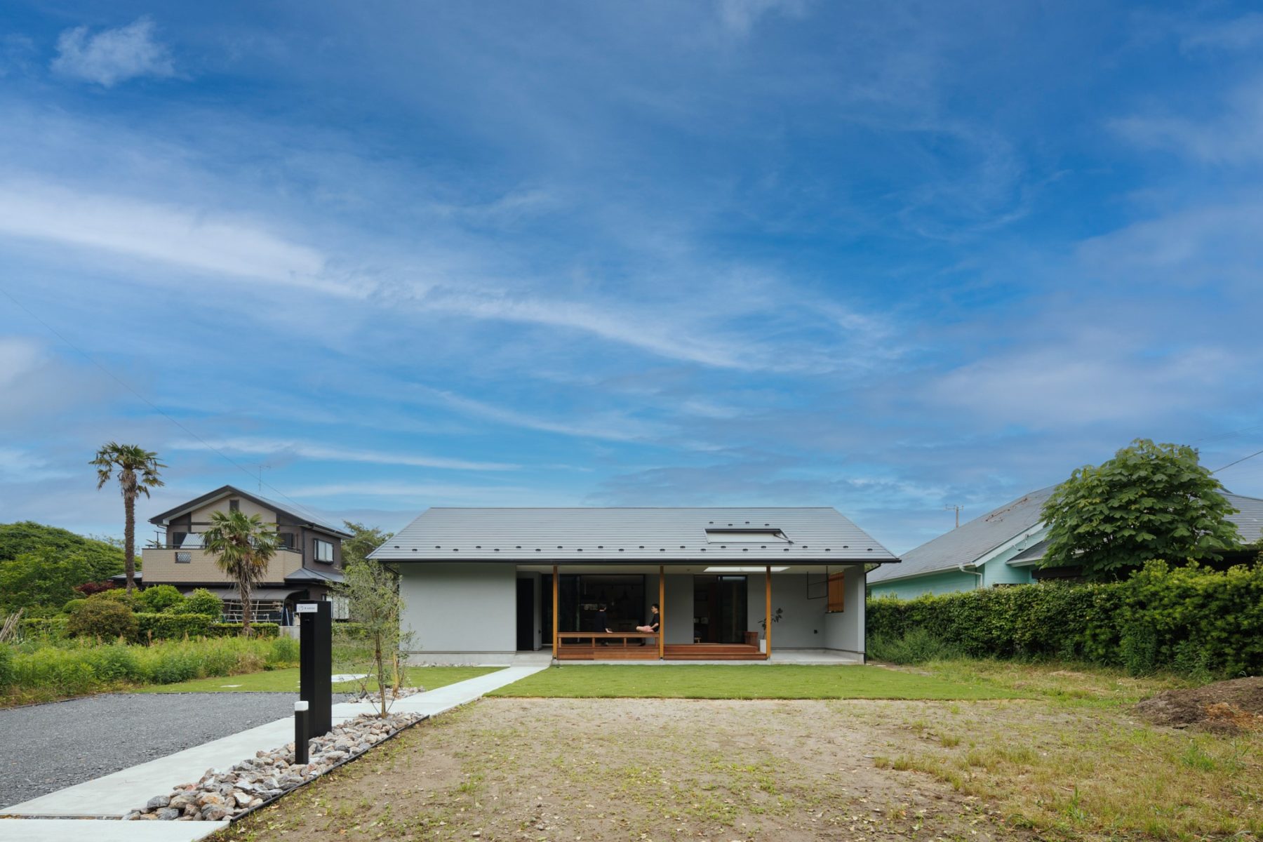 南側の『借景』を取り込む、落ち着いた平屋。空を切り取る屋根が、空間に変化をもたらす。