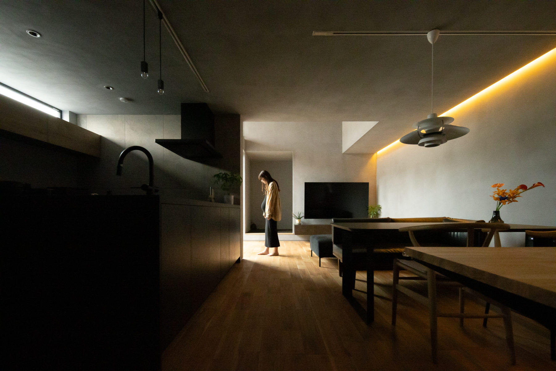 上から降り注ぐ光が壁や天井に反射し、美術館のような印象的な空間をつくり出しています。