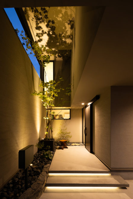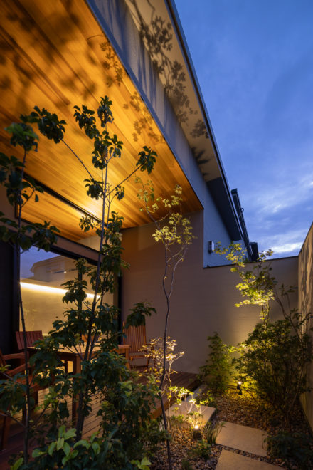植栽に囲まれた庭が柔らかな灯りに包まれ、静寂の中に温もりを感じる夜景。