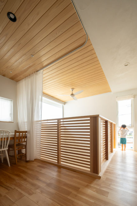 約4.5帖の吹き抜けと、杉の無節材による板張り天井。