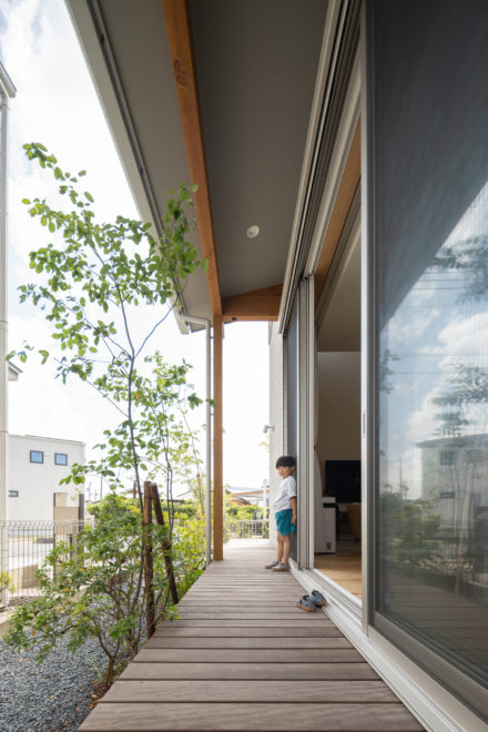 リビングから繋がる90㎝の奥行の縁側風ウッドデッキ。