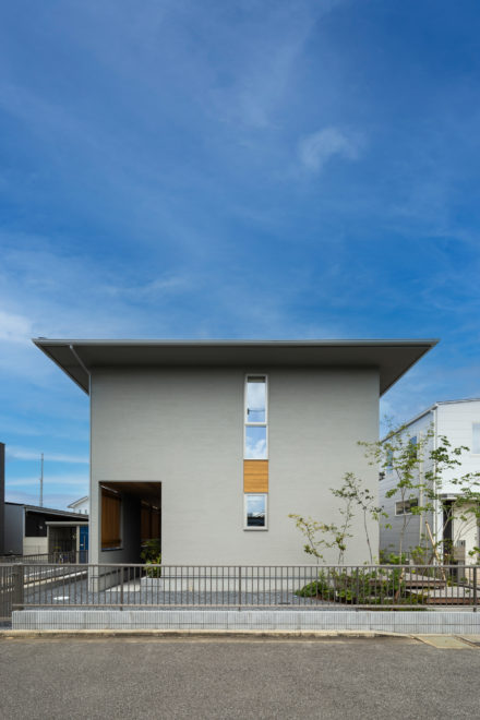 シンプルな塗り壁と縦格子を基調に、寄棟屋根を組み合わせたモダンな住まい。