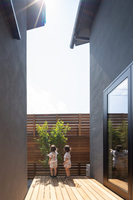 木の温もりとプライバシーを守る塀が、安心して遊べる外空間をつくり出しています