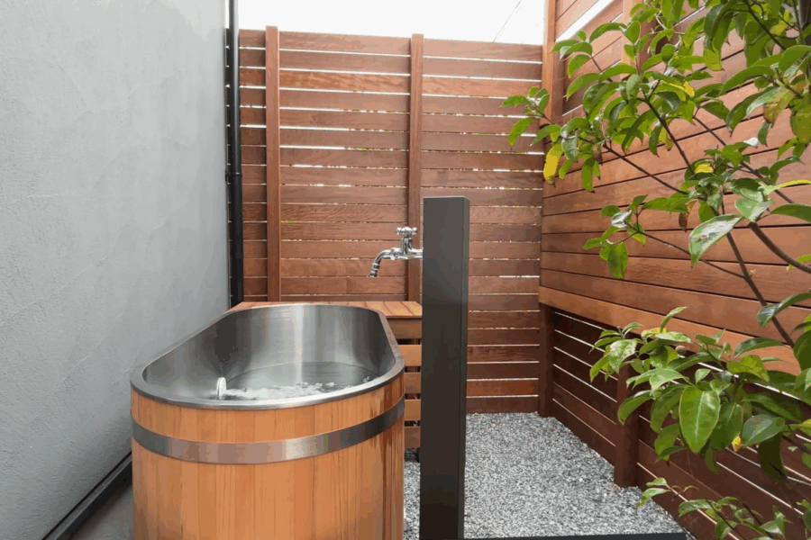 木製の浴槽と塀に囲まれた屋外の水風呂は、まるで旅館のような贅沢さ